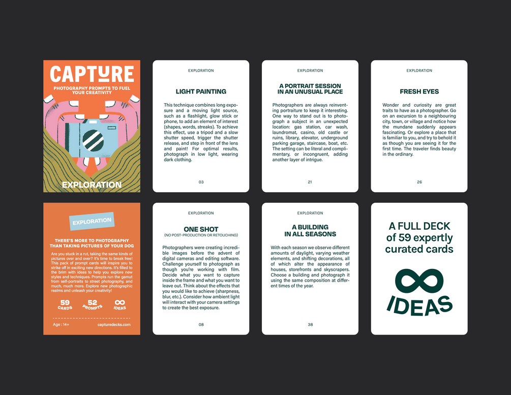 We designed the Exploration deck for photographers who, like us, were stuck in a rut. The goal was to create prompts that pushed us far beyond our comfort zones.